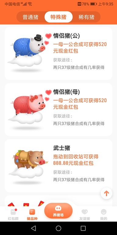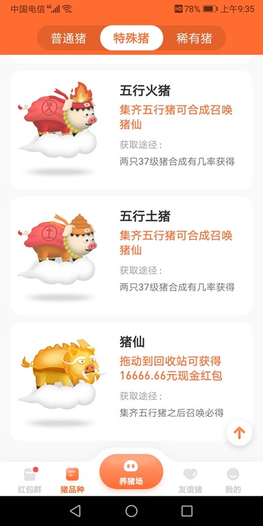 4、特殊猪,两只37级猪合成有几率获得,可兑换现金红包,最高的猪仙可获得16666元现金