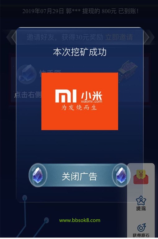 然后点击【挖矿】~将赠送的原石放入,自动显示挖矿,看8秒钟广告后关闭广告,