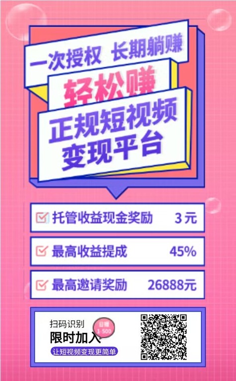《轻松赚》 正规短视频变现平台 一次授权 长期躺赚 2024年4月27日11:31:46 发表评论 2,520 次浏览 《轻松赚》 正规短视频变现平台 一次授权 长期躺赚 立即扫码,加入轻松赚,开启短视频变现收益! 项目收益: 最低提现 20元 一天提款一次 赞 0 赏 分享
