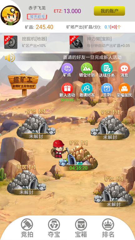 1:使用矿晶买断矿工去挖矿,买断时间只能一次8小时,矿区目前有5个