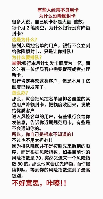 一个人不良的财务报表 , 银行风控降额封卡指标 。请立即执行断卡行动,手上信用卡数量降低最高不超过3家银行 2022年4月8日07:54:37 发表评论 2,931 次浏览 一个人不良的财务报表,个人现金流高负债低收入,财务不健康,影响个人身体心理健康 普遍社会现象,一个人多张信用卡,多头借贷,提前消费不鼓励,容易被CS催收爆炸手机通讯录,对父母亲戚同事朋友同学等有负面影响 银行风控降额封卡指标 请立即执行断卡行动,手上信用卡数量降低最高不超过3家银行 小额贷款尽快减免结清,花呗借呗网商贷备用金和微信微粒贷、美团生活费、京东白条金条等建议关闭不要用,尽量维护好个人征信良好记录 赞 0 赏 分享