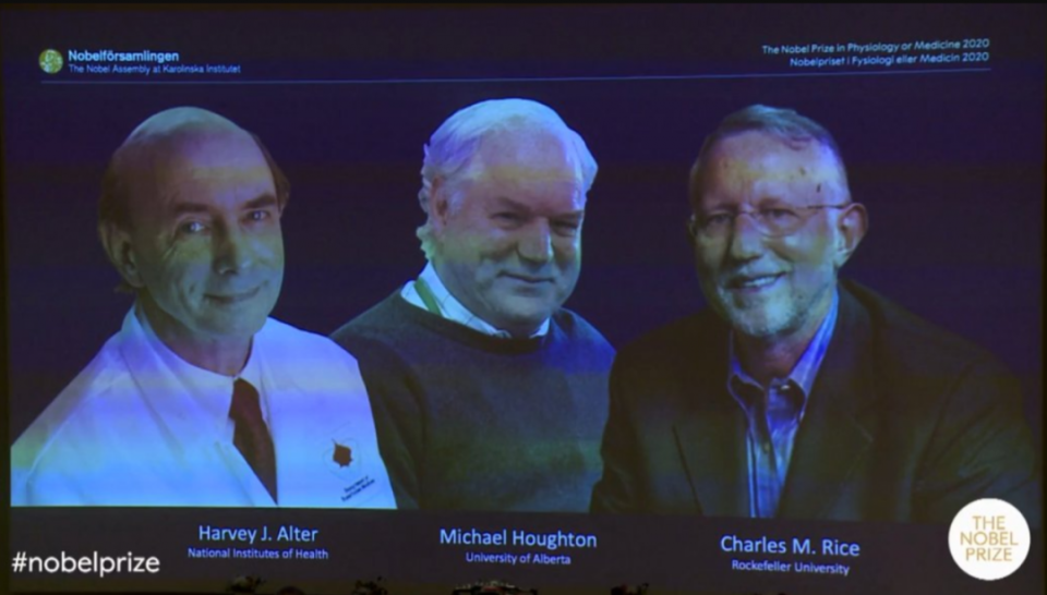 获奖的是3个人是英国的霍顿(Michael Houghton)、美国的赖斯(Charles M. Rice)以及美国的阿尔特(Harvey J. Alter)。获奖的原因是,他们发现了丙型肝炎病毒,让验血和新药物成为可能,从而挽救了数百万人的生命。就是下面三个人。