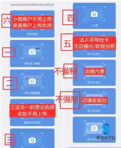 2.小微商户需要上传资料:身份证+银行卡+门头照片+店铺内景照片(上传到商户协议二)法人手持保证书或立牌收款码在店铺内/收银台前的照片(上传到商户协议图三);