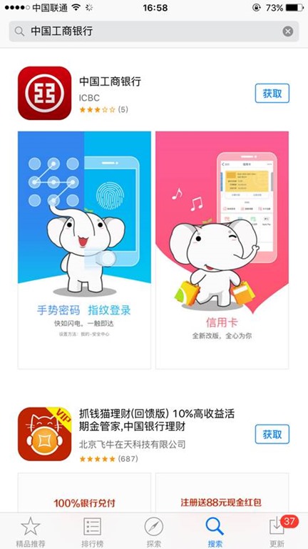 2、客户在自己的手机上应用市场,根据需要搜索并安装中国工商银行这个软件: