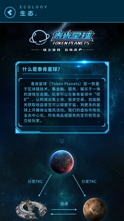 泰肯星球——时下最火爆的EOS区块链挖矿游戏,集挖矿、互动、娱乐、交友于一体,通过游戏操作即可挖矿获得TKC,未来上架数字交易平台即可进行交易。