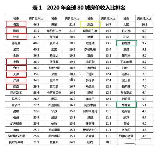 2020年全球80城市房价收入比排名 香港、深圳、北京、上海、天津、广州、南京等国内7个城市占世界前十位