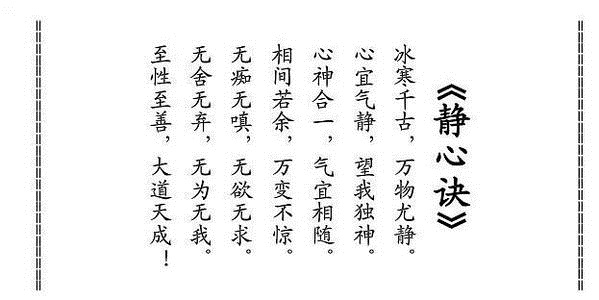 静心诀:冰寒千古,万物犹静,心意气静,望我独神,心神合一,气宜相随,相间若余,万变不惊,无痴无嗔,无欲无求,无舍无弃,无为无我。