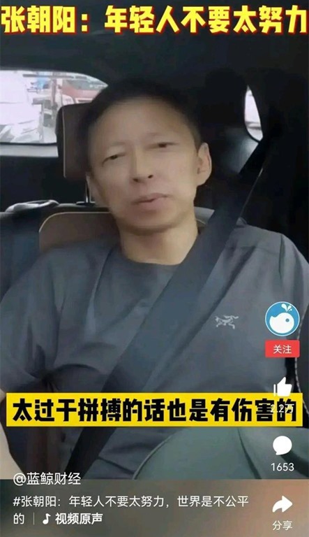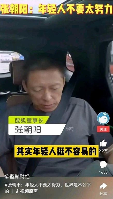 搜狐张朝阳说:如果你能力平平,家境普通,学历一般,怎么打拼也很难逆袭,或者连中产阶层也达不到,不如选择与自己和解。 规规矩矩做人,不给国家和社会添乱,不给父母增加负担,尽量让他们安享晚年。年轻人不要太努力,太过于拼搏的话也是有伤害的!