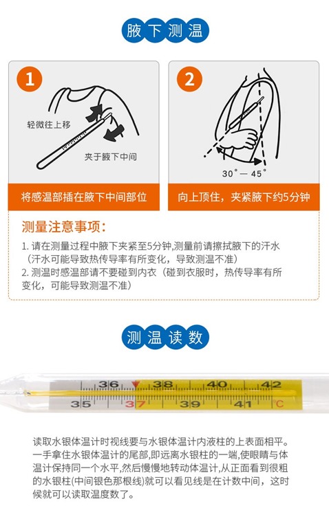 使用水银温度计,首先需要将即使用酒精进行消毒,其次需要进行矫正,将体温计内的水银甩到35度以下,其次将温度计放置腋窝中央,并且夹紧,在测量期间不要剧烈运动,保持安静的状态。