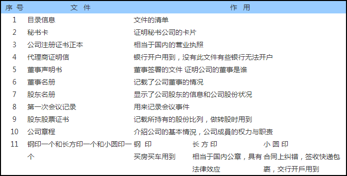 1) 公司注册证书2) 商业登记证3) 章程4) 股票5) 出任董事同意书6) 钢印、签字印7) 董事法定册子8) 注册地址通知书9) 首任董事秘书通知书10)公司记录簿