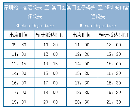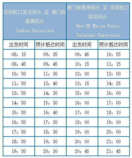从深圳蛇口去澳门有2个码头,一个是澳门氹仔客运码头,一个是澳门新港澳码头(港澳码头离机场近一些)。