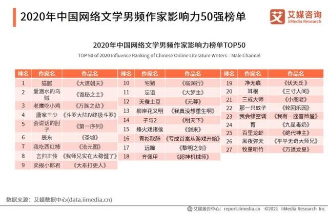 2021年1月13日,全球领先的第三方数据挖掘与分析机构iiMedia Research(艾媒咨询)发布《2020年中国网络文学作家影响力榜单解读报告》,基于2020年1月1日至12月31日相关数据,根据对作品影响力、作品销售力、作品可读性、作品IP价值四个一级指标的考量,围绕作家的作品销售情况、网络及社会影响力、文学和商业贡献等维度,评选出2020年中国网络文学男频作家影响力TOP50及女频作家TOP50,并进行相关分析解读。