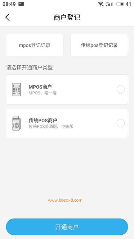 2、根据商户使用机种,如果是蓝牙MPOS机、碰一碰,就选择MPOS商户,如果是传统POS机普通版或者电签版,就选择传统pos商户