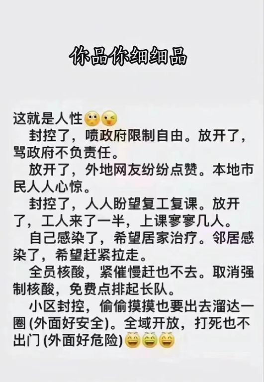 有些群众人员不自觉,封控小区内天天投诉骂政府限制自由,没钱没学上没工作收入,自己处在危险等级红区半夜翻墙进入绿区,让绿区群众健康收到很大影响,现在全区放开,地铁公交等不检测核算,自己反倒不敢出去上班工作外面逛街玩了,害怕感染变羊,反倒说外面社会很危险。