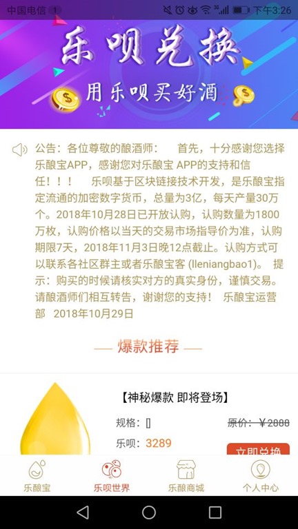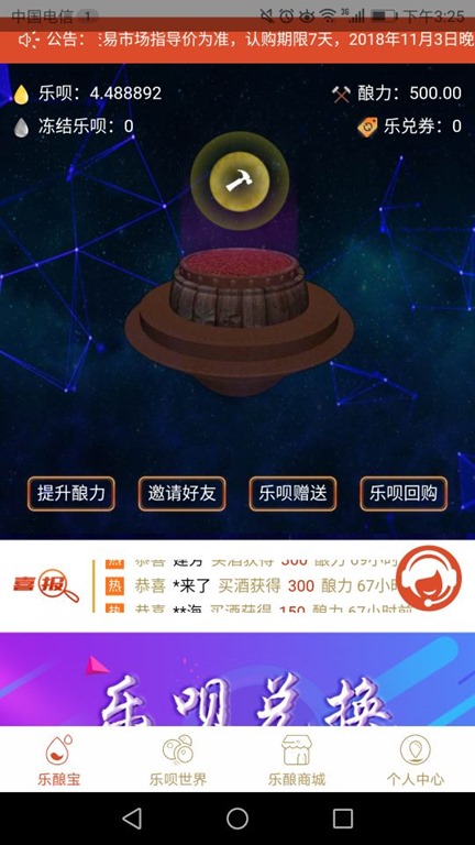 乐呗就相当于酒链世界的圣酒,乐呗可以直接在平台交易也可以兑换酒。