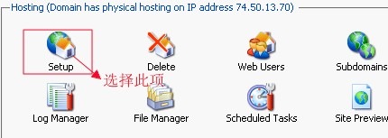 2、进入域名的主设置页面后,在Hosting菜单下选择“Setup”选项进行FTP密码设置,具体参考下图所示: