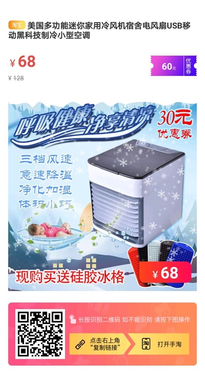 美国多功能迷你家用冷风机宿舍电风扇USB移动黑科技制冷小型空调, 原价128,【券后价】68元,让你夏季无忧 ! 2019年7月11日15:29:02 发表评论 4,777 次浏览 美国多功能迷你家用冷风机宿舍电风扇USB移动黑科技制冷小型空调, 原价128,【券后价】68元,让你夏季无忧 ! 【价格】128元【券后价】68元--------走着 ,(5yFsY6tYSbD),打开(Tao)即可 手机浏览器扫码,支持Tao扫码,马上购买美国多功能迷你制冷小型空调带回家,极速降温,净享清凉! 赞 0 赏 分享