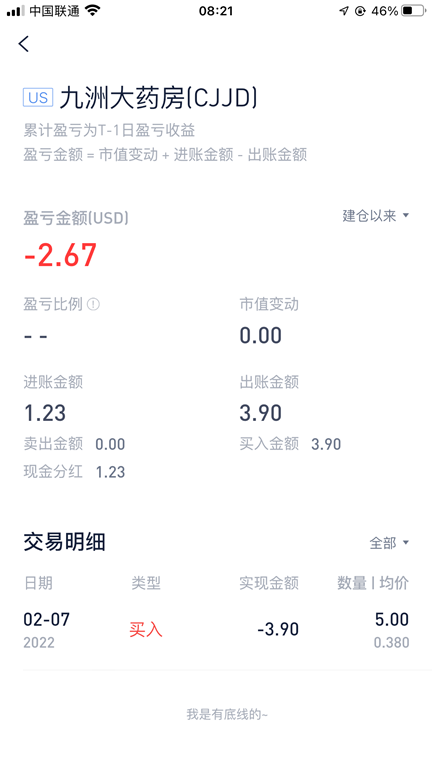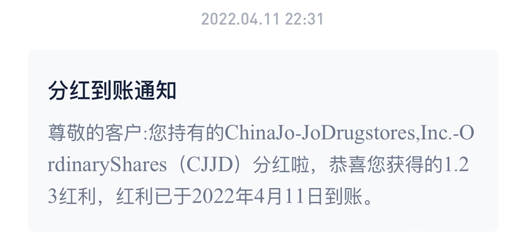 美滋滋,买入美国股票 九州大药房(CJJD)盈利,分红派息1.23美元,股票数量5股,一股单位成本0.38美元,5股制药医疗公司美国股票,投入资金成本3.9美元 ! 2022年4月12日08:57:38 发表评论 3,404 次浏览 美滋滋,赤子飞龙站长买入美国股票 九州大药房(CJJD) 盈利,分红派息1.23美元,股票数量5股,一股单位成本0.38美元, 5股制药医疗公司股票,投入资金成本3.9美元 美国股票可以购买1股,也就是散股 赤子飞龙站长看好医疗制药股票,就买入 买了5股,一股成本0.38美元 不到2个月,医疗公司就赚钱分红派息了 1.23美元 5股制药医疗公司股票,投入资金成本3.9美元 成本低高分红收益 拿起手机立即扫码,加入涨乐全球通,全球投资美股港股新加坡股中国大陆股市! 点评:美国股市值得投资 ! 赞 0 赏 分享