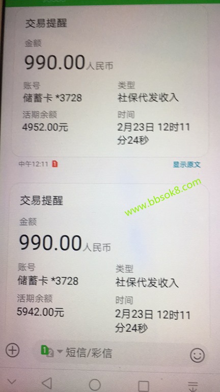 深圳建设银行社保卡每收到一条短信,就是990元一条,手机总共6条短信,有钱真好!