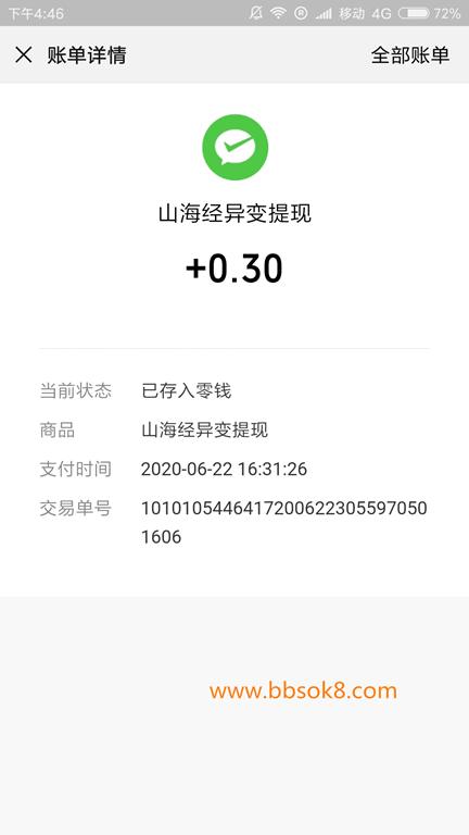 (没错,山海经异变每升一级都能获得红包,都是几毛钱),接着直接去提现3毛到微信上面,很快到账。