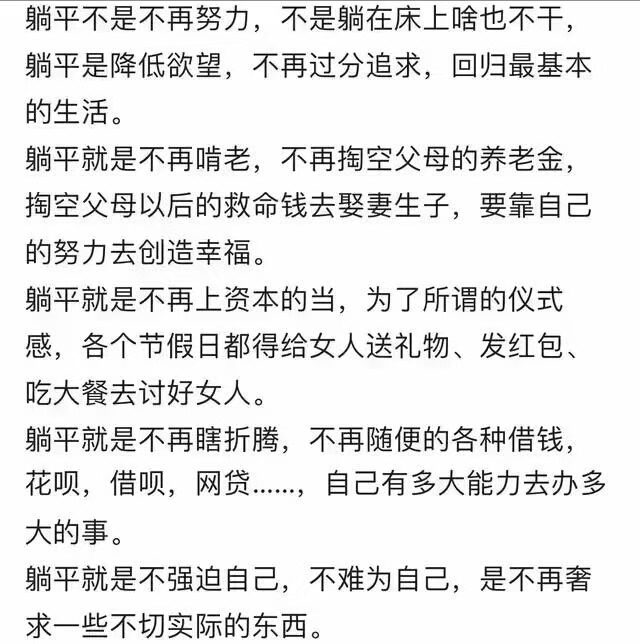 科技技术进步并没有提供给劳动阶层高地位好工作待遇,合理科学假期,越工作辛苦努力,越是天天做事越没钱,两班倒白夜班反倒身体花钱多,躺平者关爱自己身体健康和关爱家人家庭,躺平者伟大。