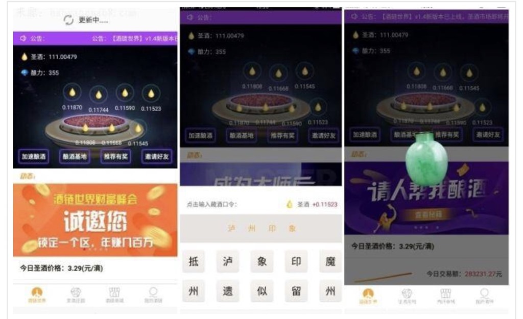 酒链世界,它现在是中国第一个酒类区块链落地应用项目,就是你用手机酿圣酒,圣酒(Token)现在价格是3.3元/滴,每月大概可以酿100-300滴酒,到年底大约是20—30元/滴,未来上涨空间还是很大的