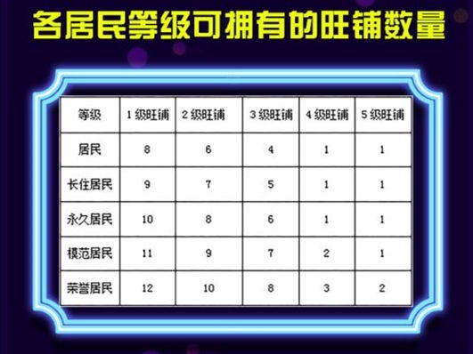 各居民等级可拥有的旺铺数量
