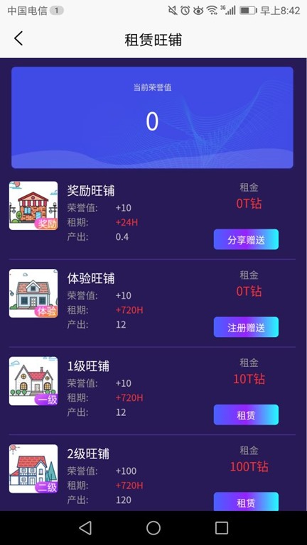 链+小镇系统,注册实名送一个体验旺铺,月产12T钻。用户邀请好友实名送奖励旺铺,存在24小时,产0.4T钻。只要推荐5个好友加入就能升级并赠送一级旺铺,支持多种不同的交易方式,数据公开透明化,便捷好用。