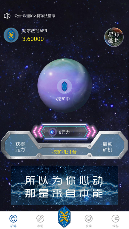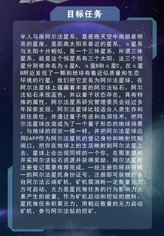 而今天阿尔法星球为你构建阿尔法星球居民身份,帮助您发现自身价值,使得个人价值得以公平公正的体现。经过星民间的共识、挖钻、增值交易,从而成为富有的阿尔法星民。我们在地球上的一举一动将会在那里同步,现在就让我们通过量子传输技术探索阿尔法星球,开启你的神秘探索之旅吧。
