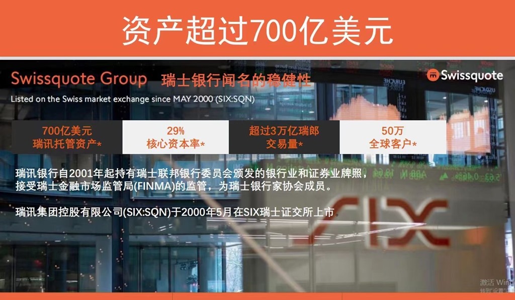 瑞士瑞讯银行SwissquoteBank是瑞士上市银行,瑞士领先的在线银行,于2000年5月29日在SIX瑞士证券交易所上市(代码SQN),总部位于瑞士格朗(VD),在苏黎世、伯尔尼、卢森堡、迪拜、新加坡、马耳他和伦敦设有办事处。