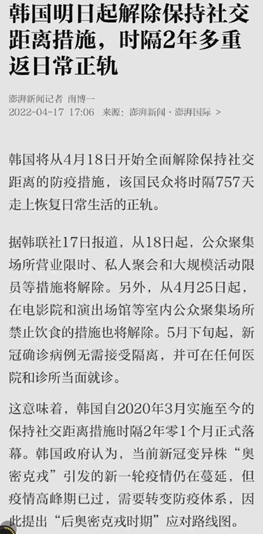 韩国解除防疫保持社交 韩国从4月18日解除保持社交举例措施,时隔2年多重返日常正规 2022年4月21日21:20:36 发表评论 4,612 次浏览 韩国解除防疫保持社交 韩国从4月18日解除保持社交举例措施,时隔2年多重返日常正规 赞 0 赏 分享