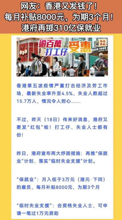 香港又发钱了,月收入低于3万元每月补贴8000元,期限3个月。临时失业支援:合规失业人士,可申请一笔过万元资助。 2022年3月21日20:53:43 发表评论 2,821 次浏览 香港又发钱了,月收入低于3万元每月补贴8000元,期限3个月。 为了应对新冠病毒给香港市民带来的影响,香港政府决定: 对月收入3万元的雇员每个月补贴8000月,为期3个月。 合格失业人员可申请1万元资助。 怪不得那么多香港人宁愿住很小的房子也不放弃香港户口呢? 赞 0 赏 分享