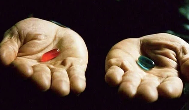 电影中,墨菲斯告诉尼奥,他一直生活在电脑模拟的世界里。他给了尼奥两个选择:要么吃下蓝色药丸,回到虚拟世界里,忘记一切;要么吃下红色药丸,去了解关于黑客帝国的真相。