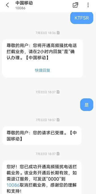 第三步:按提示发送短信至10086开通高频骚扰电话防护业务。
