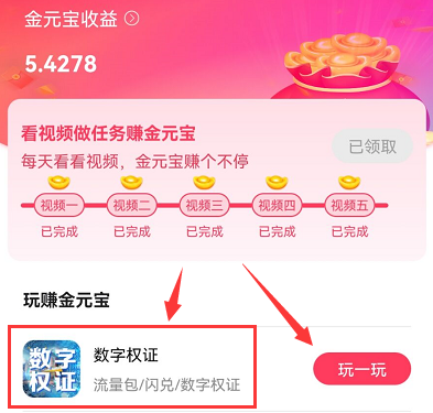 在【赚元宝】页面,点击“数字权证”,如下图: