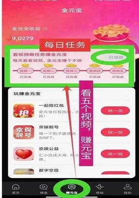 每天任务:底部赚元宝,看5个广告并领取收益