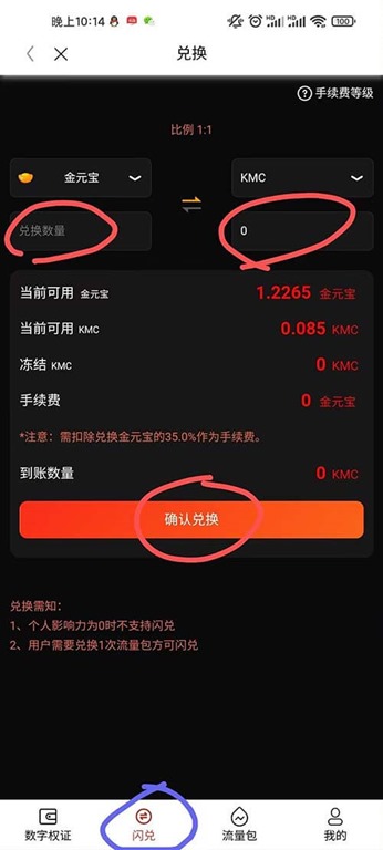 交易:底部赚元宝~数字权证~闪兑,先闪兑成kmc再链上转赠,转赠一笔手续费扣0.1