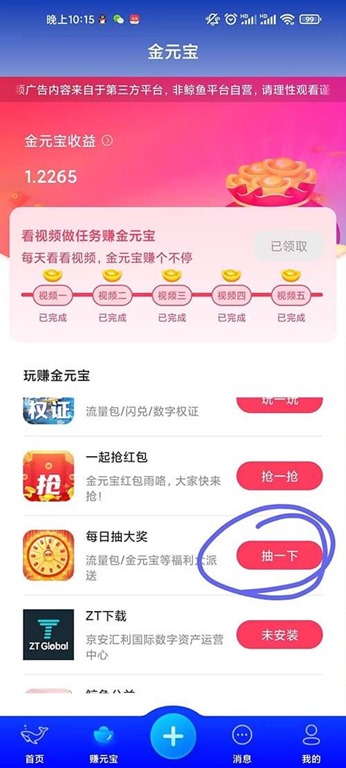 鲸鱼短视频是中国京安平台推出的一款短视频平台,注册认证好之后每天看完五个视频就可以领取0.5个金元宝金元宝够10个之后可以点击数字权证然后兑换更多的流量包,这样每天的产出的就会越来越多,使用这个方法复投就可以快速发展起来。