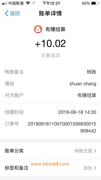 2019年9月18日收到《有赚区块链》区块链赚钱平台收款10元,实力平台值得信赖,赶紧抓住机会赚大钱!