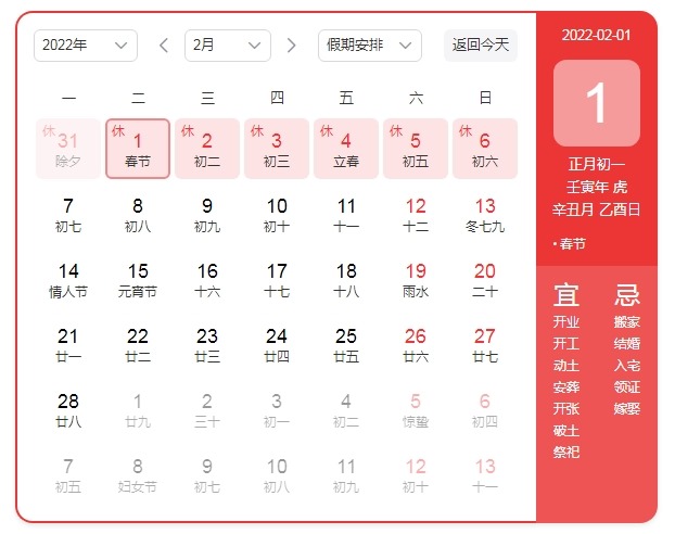 2022年春节:阳历2022年2月1日 正月初一壬寅年 辛丑月