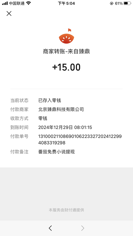 2024年12月29日番茄小说提现15元 2025年2月15日18:15:08 发表评论 1,416 次浏览 2024年12月29日番茄小说提现15元 看小说收入,达到15元,微信提现15元到账! 立即加入番茄小说,看小说增加收入! 收款图: 赞 0 赏 分享