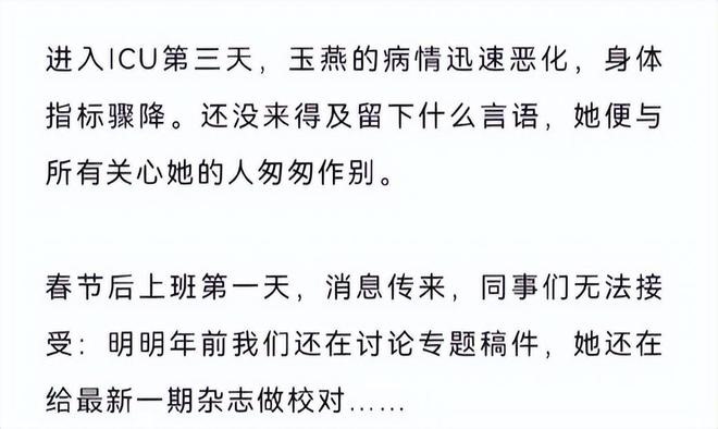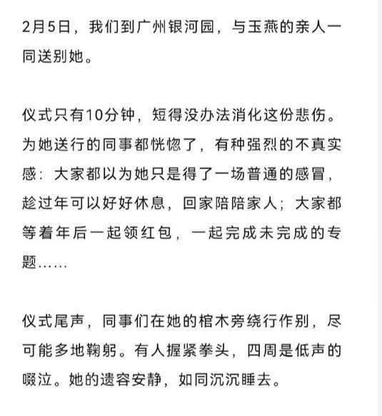 2月15日,媒体圈传出一则噩耗,广东《新周刊》媒体人吴玉燕因病去世,年仅41岁。