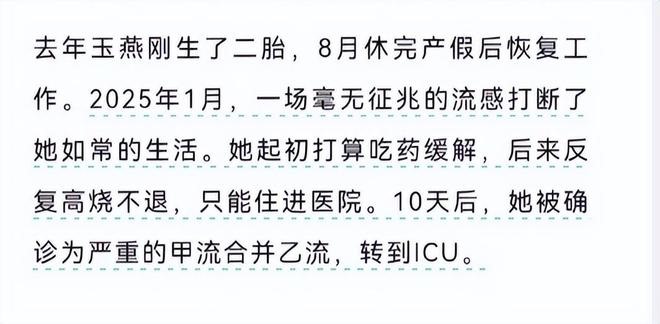 2025年1月,吴玉燕感染流感,住进医院并于10天后确诊严重的甲流转入ICU。