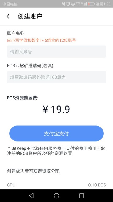 开通EOS账号 需要支付宝支付19.9人民币  价格合理 给用户的福利  成本价