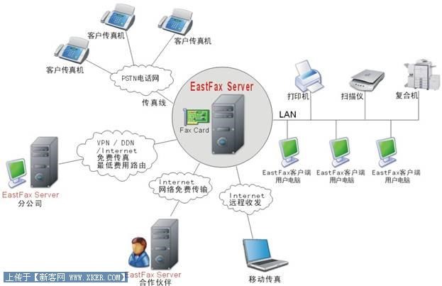 上图当中灰色的圆圈部分就是EastFax传真服务器了,用户的电脑装上客户端后是通过局域网和服务器电脑进行连接的。另外我们还看到分公司、合作伙伴、移动传真、复合机等等,这些都是这款软件其他的扩展功能,我们这里就不做介绍了。