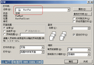 操作方法也很简单,首先打开需要发送的文档,以Doc文档为例,双击打开Doc文档,在Word中选择“文件”菜单下的“打印”,再选择“EastFax”这个虚拟打印机(这个设备会在客户端程序安装时自动安装到系统上)进行打印,如果客户端已经开启则会跳出已添加这份文件的新建传真的窗口,所添加的格式为转换好的tif类型,然后在收件人处输入对方的传真号码再发送即可,如果在打印时未开启客户端的话,则会要求先登录,然后才会跳出新建传真窗口。