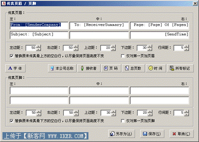 大家可以看到在图中区域内,已书写有多种用中括号括起的英文,这种书写格式的英文表示的是变量,不同的变量名称会在页眉页脚上自动显示不同的信息,比如图中的TO:[ReceiverName] ,则在发送传真后会显示成 TO:某某某(所发送的收件人)。