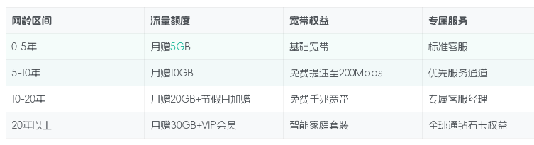 以“15年网龄用户”为例:“月度收益”:20GB流量+千兆宽带+专属客服“年节省成本”:约“1200元/年”(流量+提速费用)“隐性价值”:“VIP会员权益”与“全球通机场贵宾厅”等