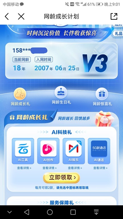 中国移动“网龄回馈计划”是针对长期用户的专属福利体系,通过“在网时长”与“差异化权益”的结合,构建起“用户忠诚度-服务质量”的正向循环。